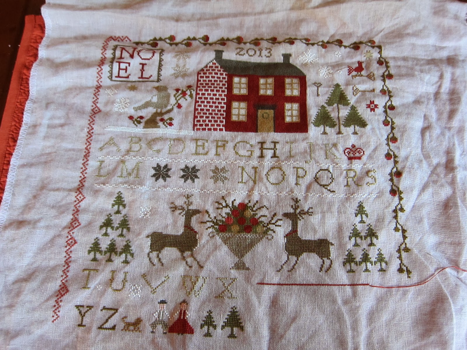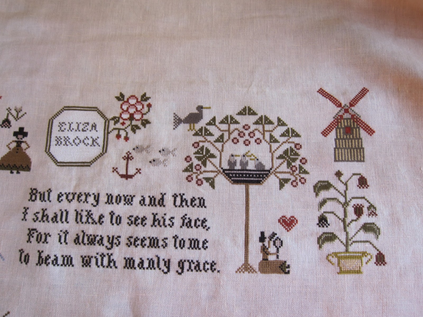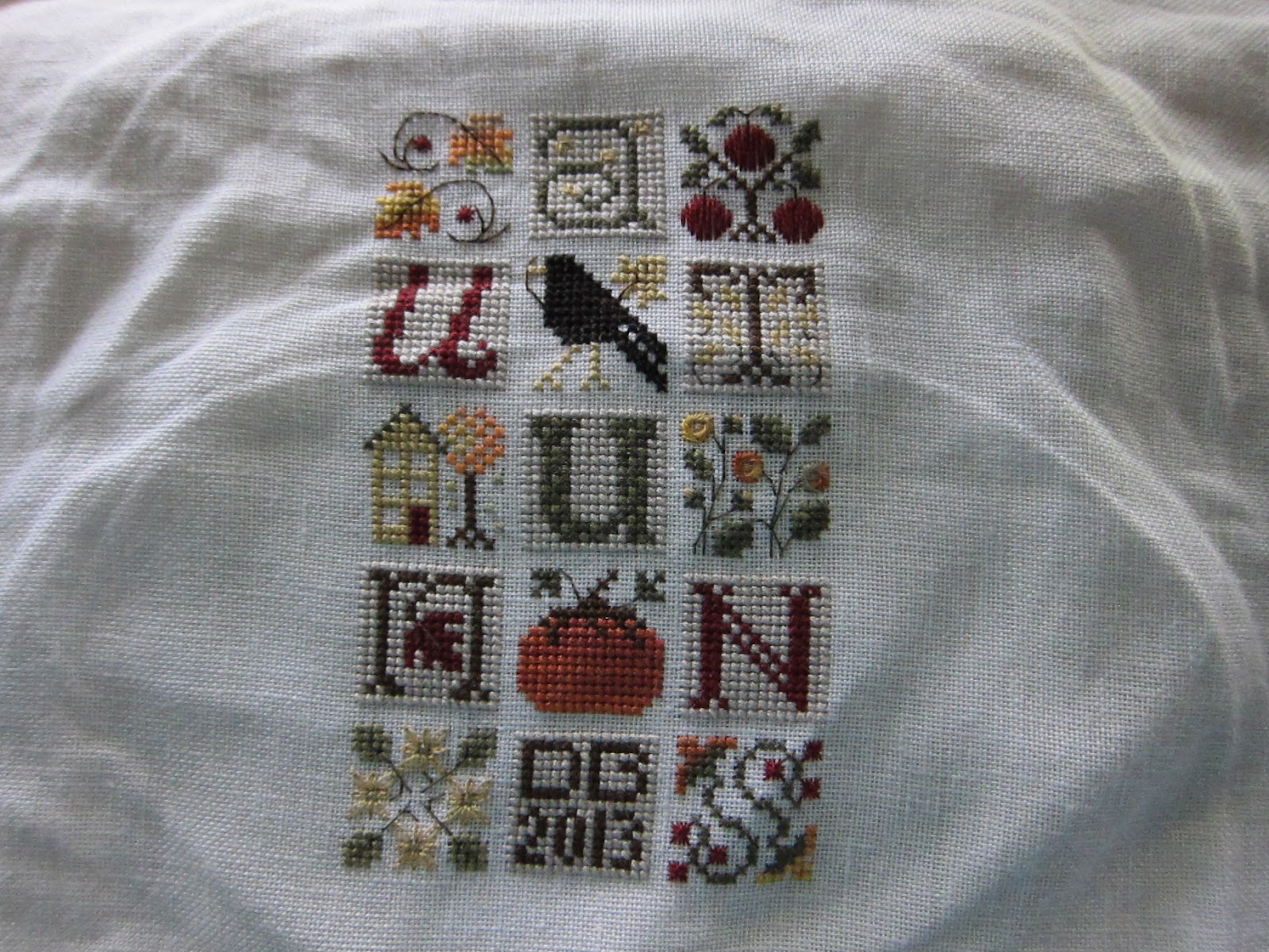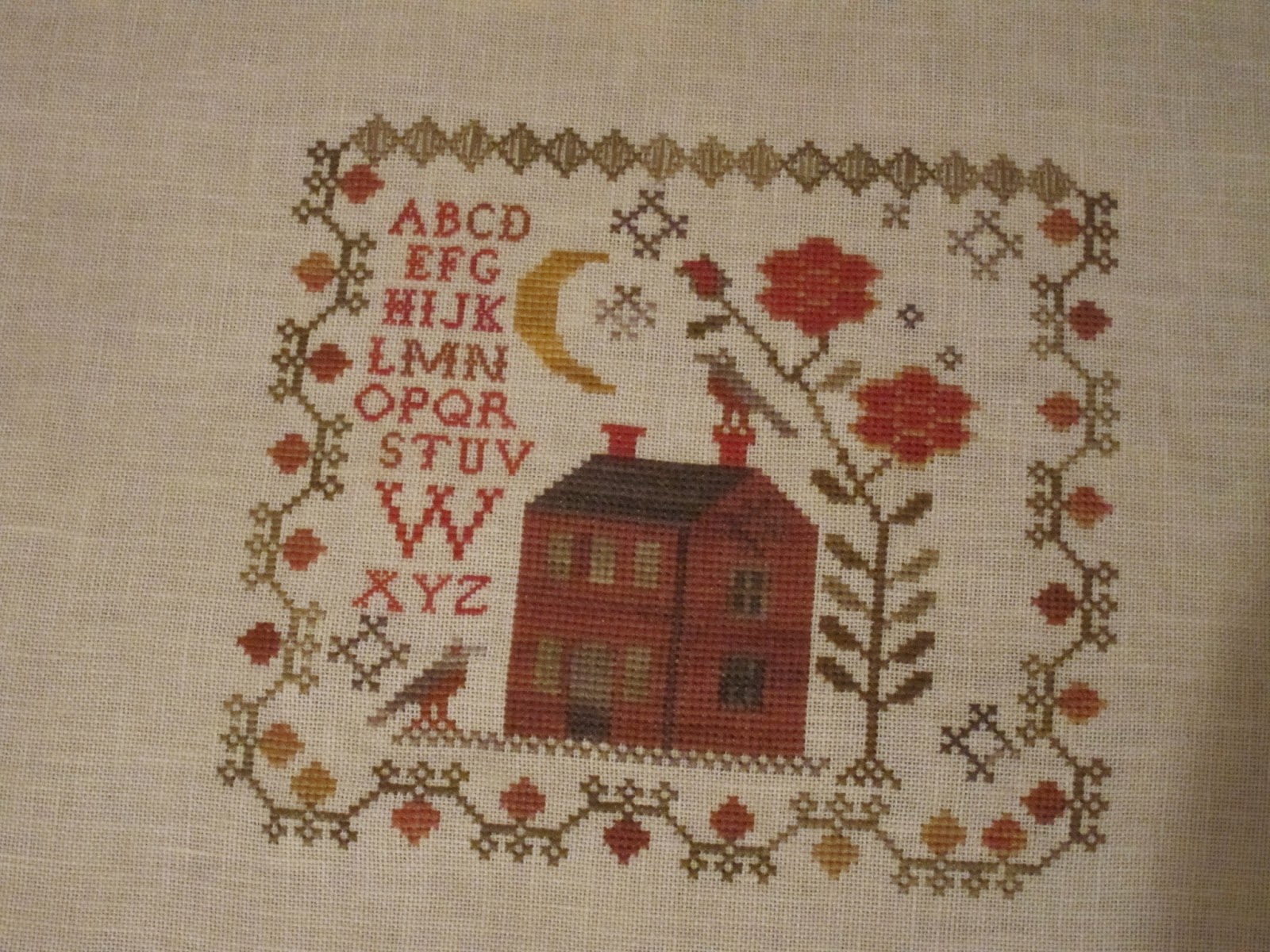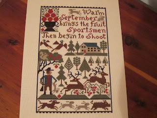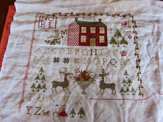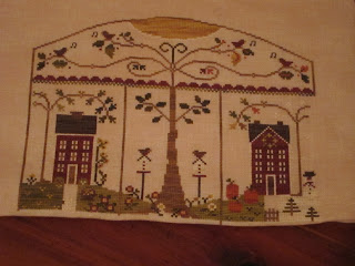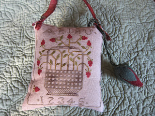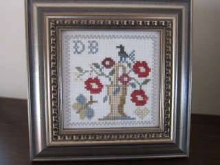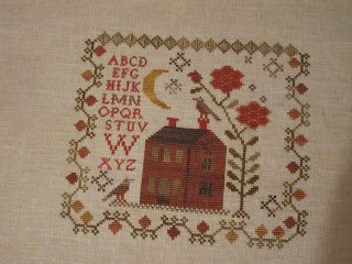 I will post a picture of the piece after it's finished on the hornbook. Lastly, is a new design by WTN called The Sewing Bird. So cute. It will be finished into a little pillow. I used 36 ct exampler fabric withe called for GA and Wks fibers.