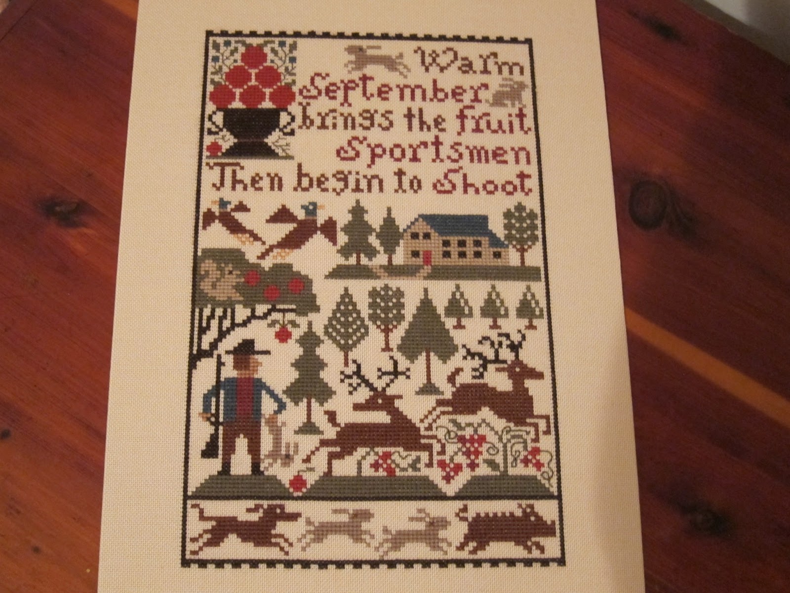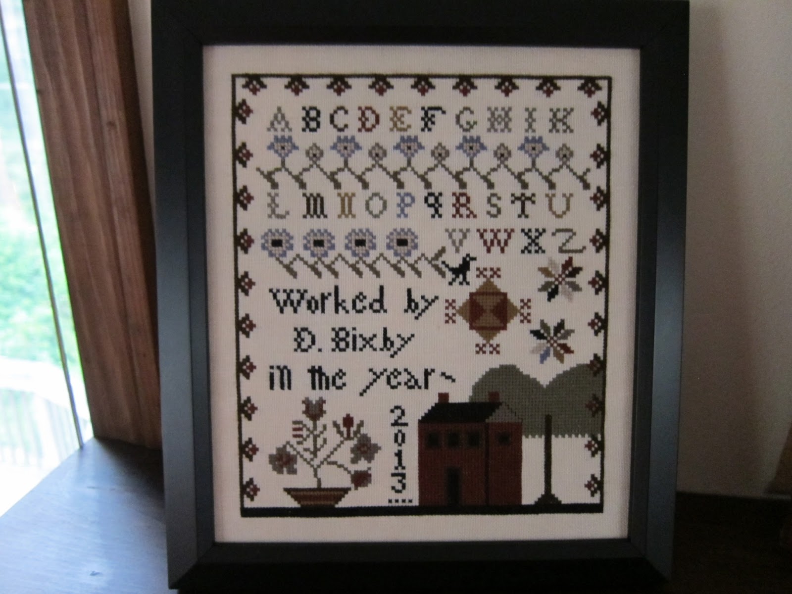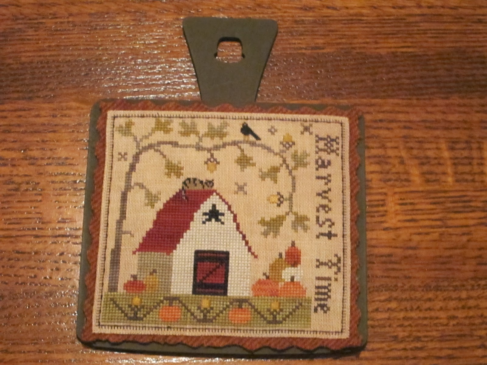The fabric is not pink. It has been raining almost daily here and I couldn't get a good picture. It's a 30 ct fabric that is a beige color. Thanks to Peggy Lee I used Distress It on the piece and i fell in love with the stuff. It makes the piece look so old. My friend, Nataly, made the strawberry. It was the first time she did one and it is perfect. Thanks, Nataly! Next is The Bee Skep by BBD. This is a sweet design. I used 36 ct strawflower linen and GA fibers. The frame is a cherry color. It goes well with the piece. You will note that I forgot to do the bees in the design. Oh well. I still love it.