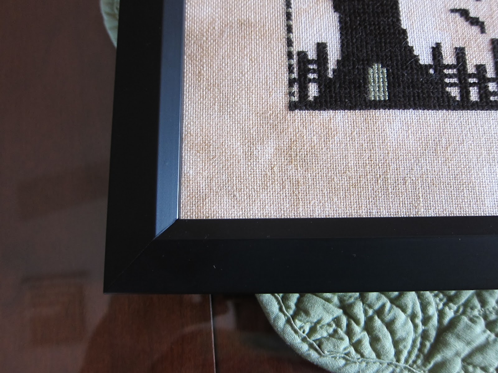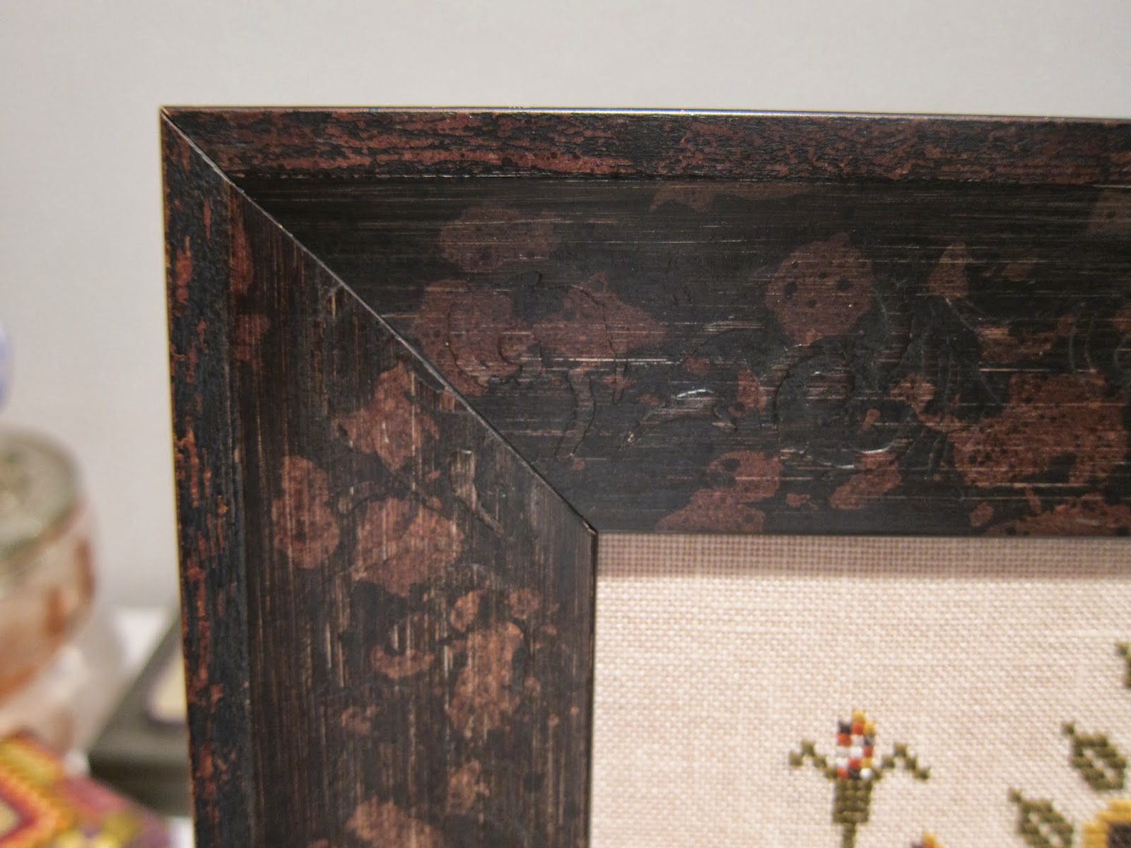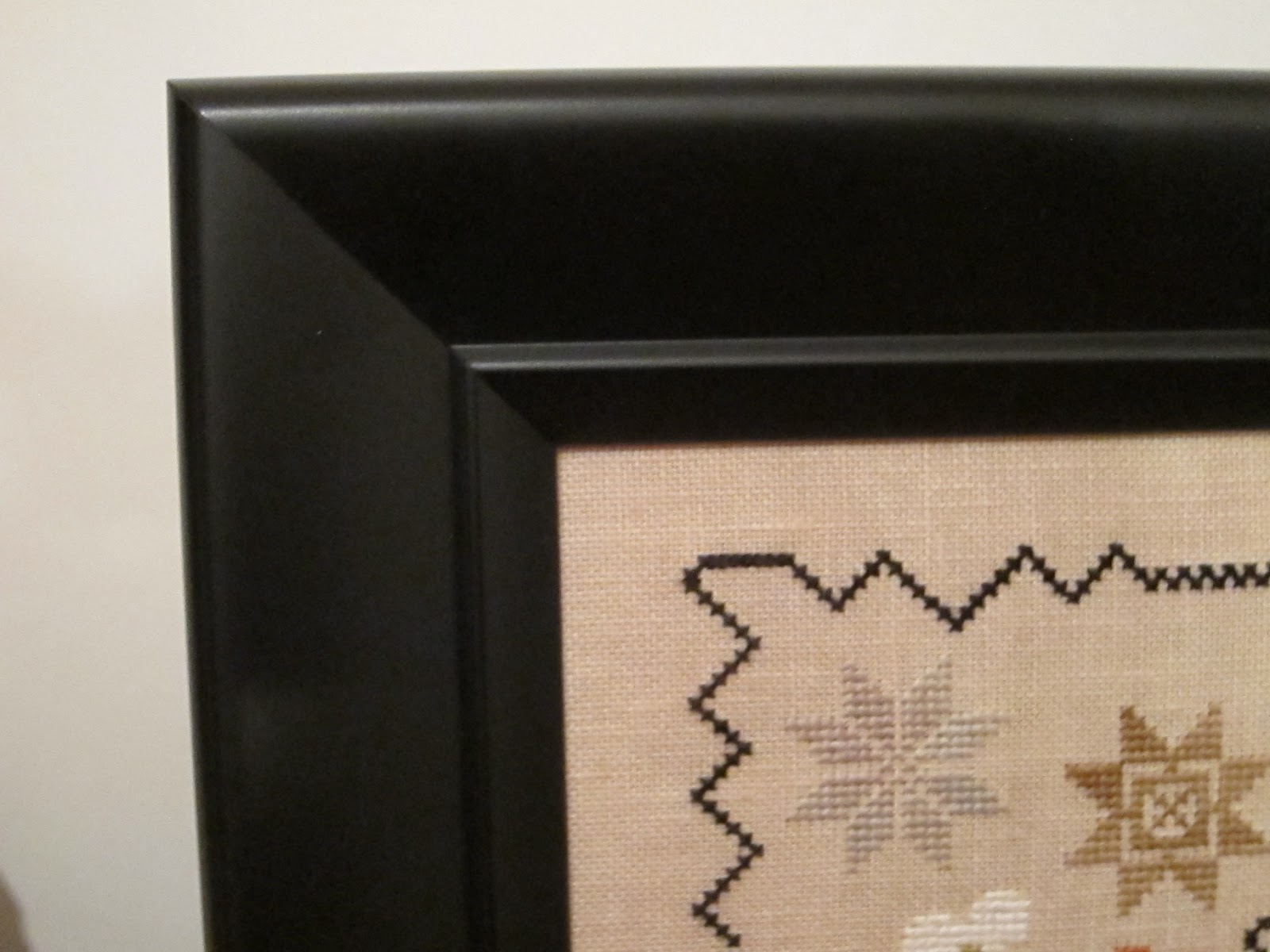 The fabric is not pink. It has been raining almost daily here and I couldn't get a good picture. It's a 30 ct fabric that is a beige color. Thanks to Peggy Lee I used Distress It on the piece and i fell in love with the stuff. It makes the piece look so old. My friend, Nataly, made the strawberry. It was the first time she did one and it is perfect. Thanks, Nataly! Next is The Bee Skep by BBD. This is a sweet design. I used 36 ct strawflower linen and GA fibers. The frame is a cherry color. It goes well with the piece. You will note that I forgot to do the bees in the design. Oh well. I still love it.