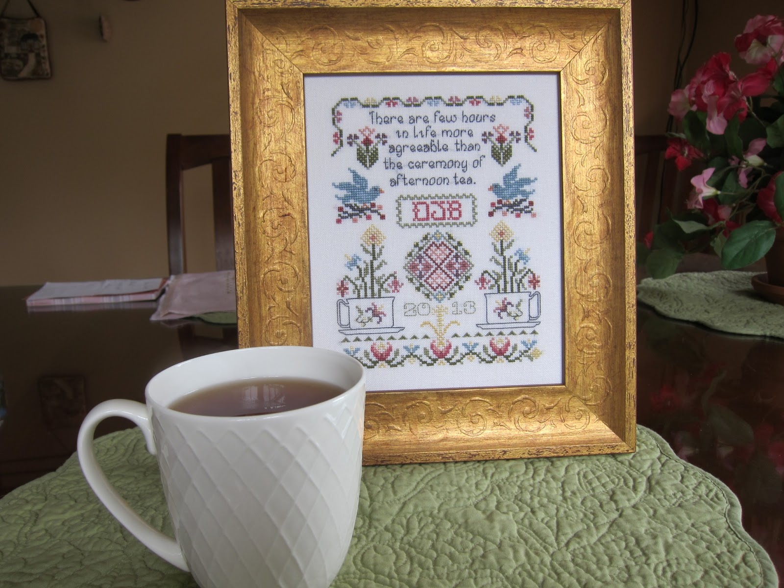 I had this little frame in my stash. I love when that happens. Next is a design I bought at celebrations. It was a special from Rosewood Manor just for Celebrations called Afternoon Tea. It came with the fabric and wonderful silks. It was packaged with the tea cup.